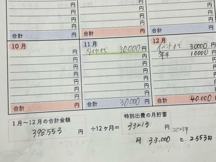 毎月かからないけれど、かかるときは費用が大きい自動車税や誕生日やクリスマス、お正月などのイベント費用などの「特別出費」。車検など数年に1回のものを含めると意外といろいろあることに気づくかと思います。わが家はかつて、毎月の給料から、その月に必要な特別出費を出そうとしていましたが、足りずに貯金を切り崩す失敗経験がよくありました。この記事ではインスタグラムで節約・家計簿の情報発信をしている(@ame.320)が、特別出費の積み立てについて解説します。