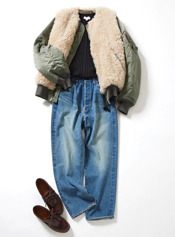 展示会でおしゃれな人たちに大人気だったというハイクのブルゾンは、MA-1にエコ素材のボアベストをレイヤードしたようなデザイン。はおるだけで即効おしゃれに。ボアが華やかなので、ボトムはシンプルに、ストレートワイドの古着ライクなデニムと合わせて気負いなく。足元はきれいめシューズで大人度アップ。