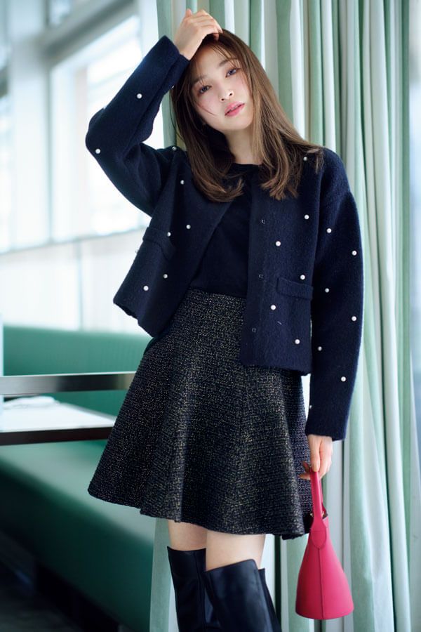 若見えを回避するならモノトーンでまとめるのが定石だけれど、落ち着き感とこなれ見えを欲張るならネイビーやツイード素材をMIXして、メリハリを意識してみて。ニーハイブーツで引き締めれば、フレアシルエットとの対比でスタイルアップも叶う♡