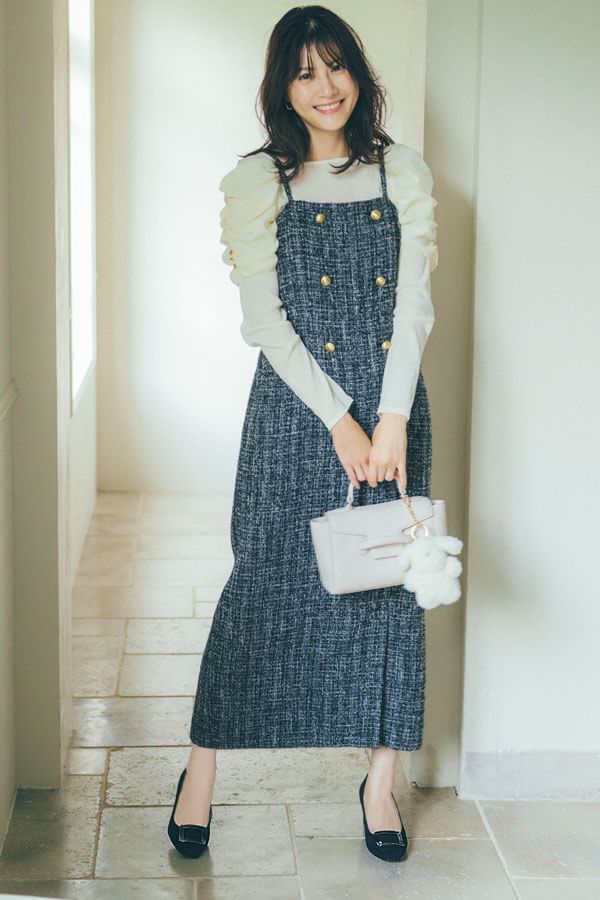 リッチな光沢感が魅力のベロア×ツイードのハイソなコンビネーションで、秋のジャンスカルックを今っぽくクラスアップ。くしゅっとタックを寄せたショルダーデザインなら、今回のようなレイヤードスタイルだけでなく、1枚で着るときも着映え度確実です。