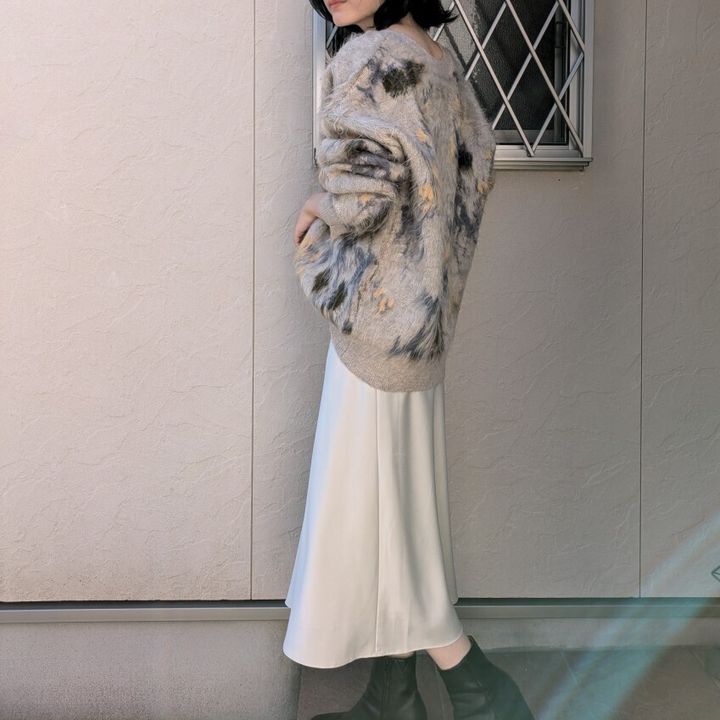 カーディガンが毛足が長いフェザーでふわっとしているため、質感が違うツルっと光沢感あるサテンともよく合うと感じました。足元はブーツがスッキリ見え!