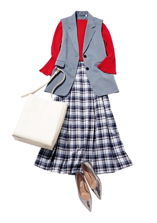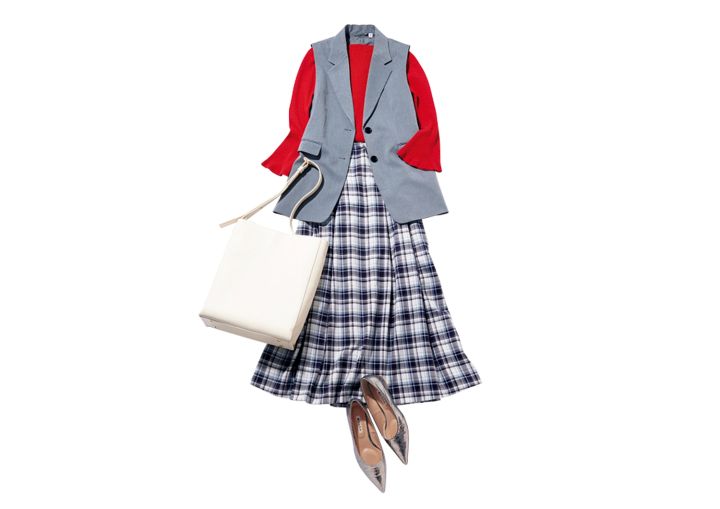 ジレ¥3,990/GU チェックスカート¥15,400/MERCURIDUO(MERCURYDUO ルミネエスト新宿店) リブニット¥9,900/CELFORD ルミネ新宿2店 トートバッグ¥13,000/PLST シルバーパンプス¥16,500/ダイアナ(ダイアナ 銀座本店)