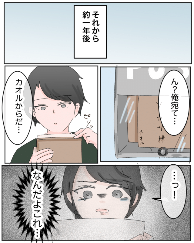 そして一年後、離婚した妻、カオルから封筒が送られてきた。離婚だってカオルの条件を飲んだし今さら何の用だろう?そう思って封筒開けた。