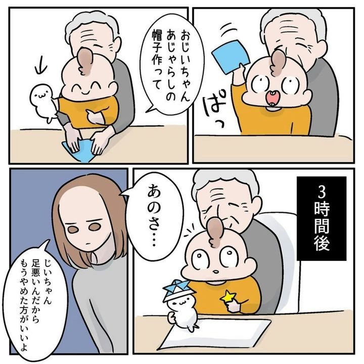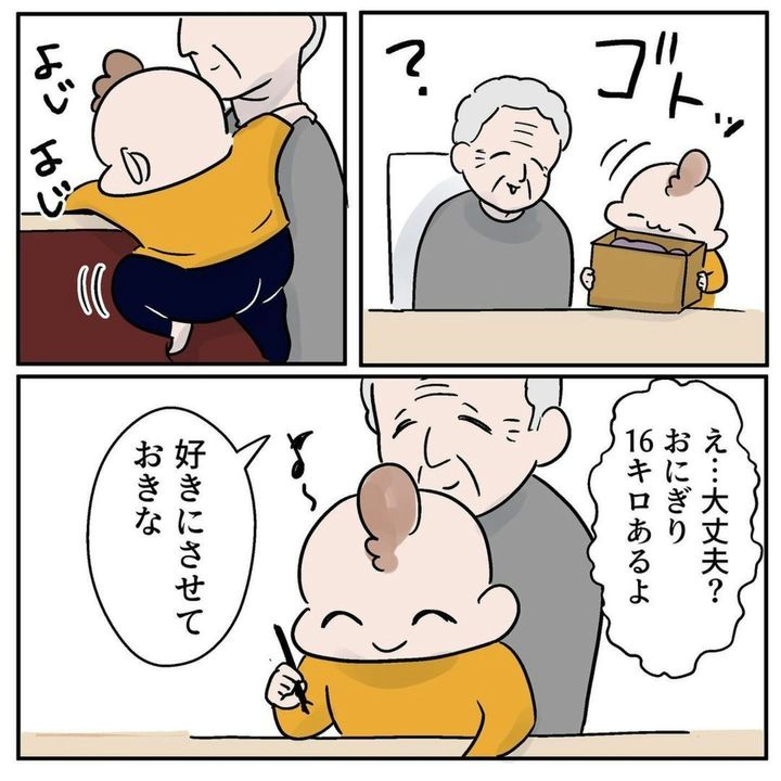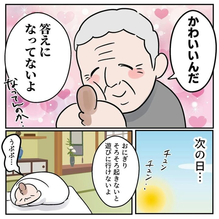 わが子と祖父母との交流は見ていて癒やされますよね。自分がかわいがってもらった記憶がある人は、わが子との交流に感慨深いものがあるかもしれません。祖父母が孫をかわいがってくれることはとてもうれしいですが、時に結託されると厄介なコンビであることも…。こばん(@kumagoma0731)さんの祖父と、わが子の日常を描いたほのぼのとしたエピソードをご紹介します。皆さんのわが子と祖父母はどんなふれあい方をしていますか?どうぞごらんください。