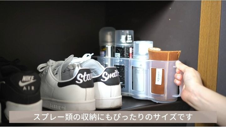 「缶ストッカー」は缶の収納だけでなく、水筒や靴ケア用品を片付ける際にも使えます。