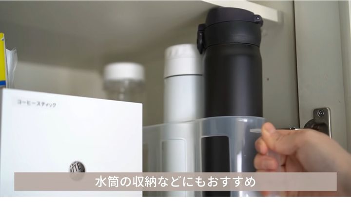 缶ストッカーのサイズにぴったりなものの1つが水筒(缶の太さまでのもの)。水筒をそのまま食器棚やつり戸棚に詰めると倒れてしまったり、扉を開けた瞬間に倒れてきたりすることも。