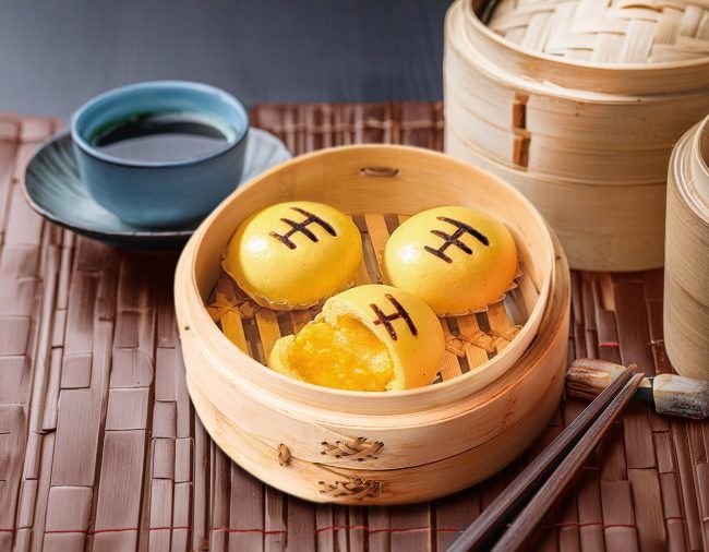 梅田茶屋町店限定メニュー「カスタード虎饅頭」780 円も登場。カボチャを練りこんだ黄金の生地で、塩卵の卵黄を使用したトロっと濃厚なカスタードクリームを包んでいます。金運アップの象徴である虎柄を施した、縁起物としてもおすすめな一品。