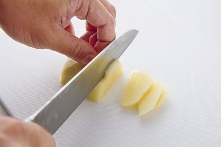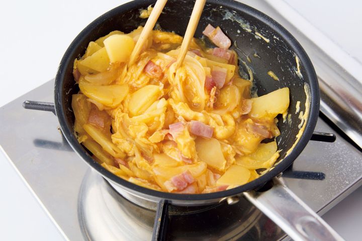 (1)じゃがいもは皮をむき、幅3mmの半月切りにして水でさっと洗い、水けをきる。玉ねぎは縦に幅2~3mmに切る。ベーコンは幅1cmに切る。ボールに卵を割りほぐす。フライパンにオリーブオイル大さじ1とじゃがいもを入れ、ふたをする。