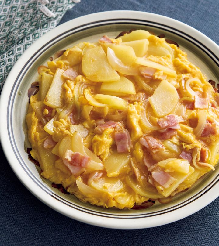 『ベーコン入りスペイン風オムレツ』は、旬のじゃがいもがゴロゴロ入った、さっと作れてうれしい一皿。片面焼きにすることで、卵のとろとろ感を楽しめる上、時短にもなる一石二鳥のレシピです。