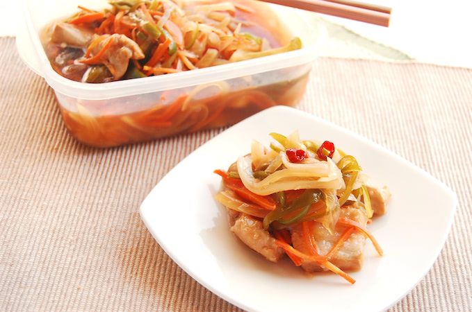 ピーマンとにんじんは生で漬け込んだので、シャキシャキしていて、瑞々しさもあります。玉ねぎは軽く火を通したので、シャキシャキした食感を残しつつも、ツンとする辛味はなく、甘味が引き出されています。