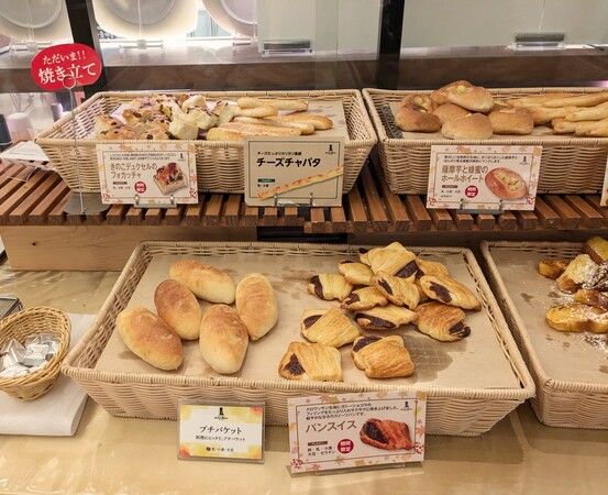 炊きたてのパンは、店員さんからアナウンスされます。パンが陳列されている場所にも「焼き立て」が表示されています。写真の左下のようにバターが置いているので「プチバケット」や「塩パン」など、シンプルなパンに塗るのもよいでしょう。