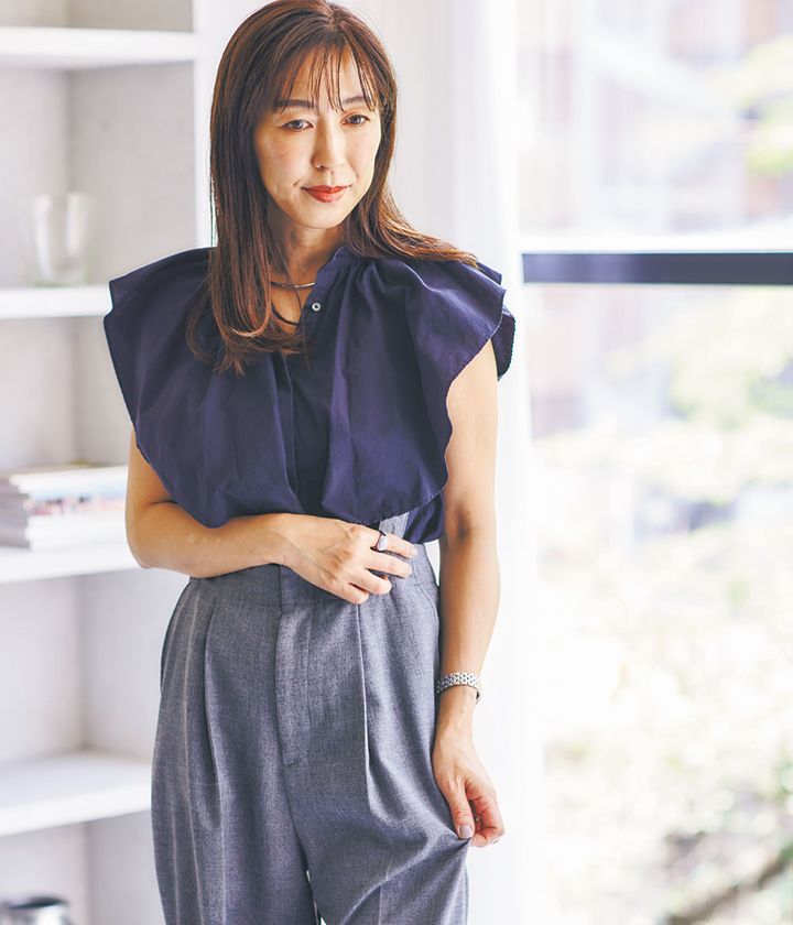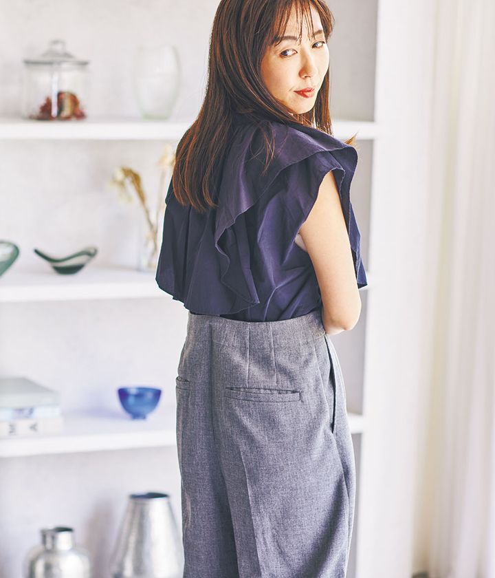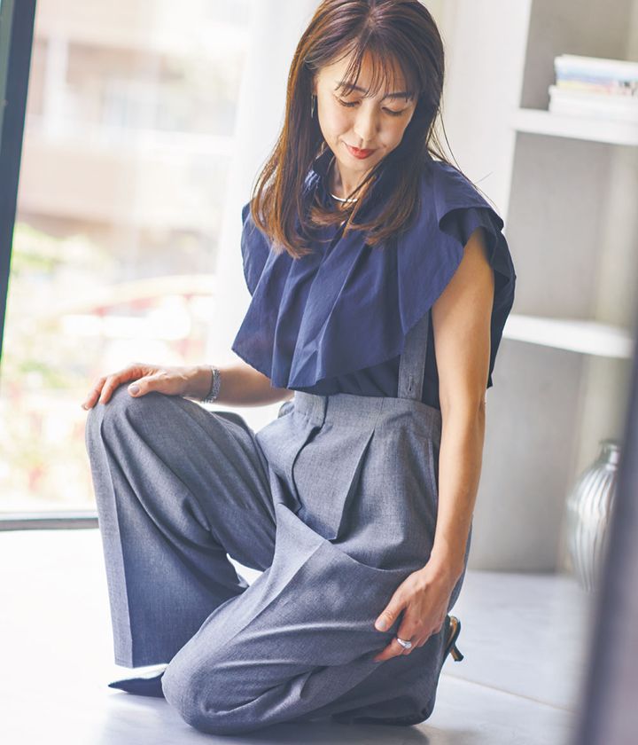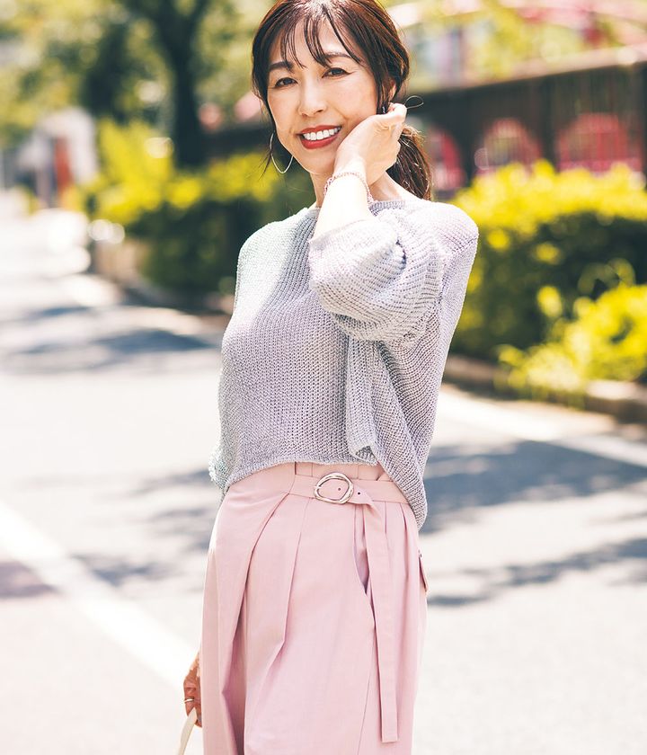 『アシメトリーデザインは新発見! ワイドパンツはゆとりがあり自然に脚のラインをカバーしてくれました。ピンクはチャレンジでしたが、チノワイドパンツなら甘すぎず◎。』