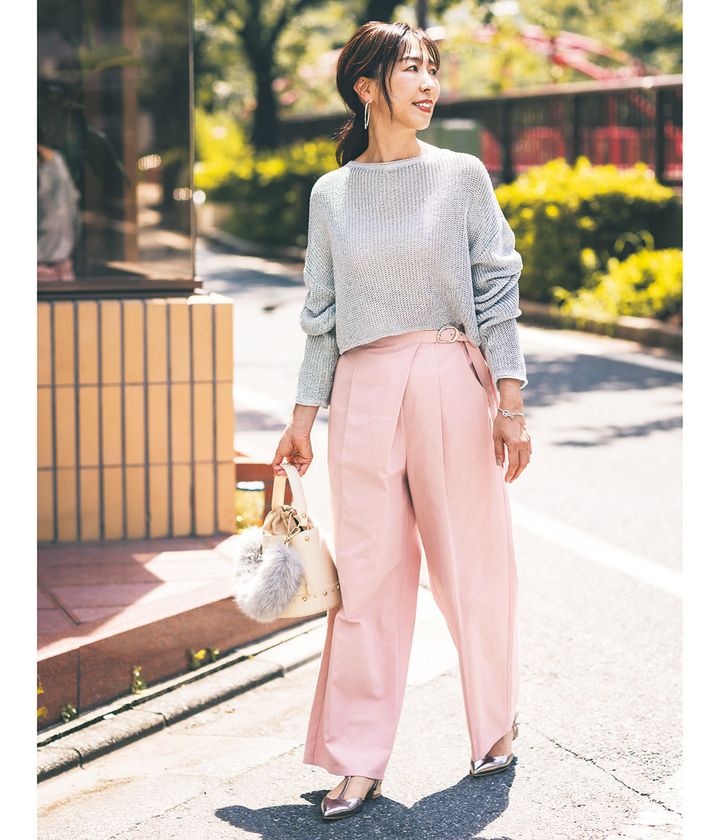 パンツ¥19,800(マイストラーダ)ニット¥19,800(ミースロエ)バッグ¥15,950フラットシューズ¥17,600(ともにダイアナ/ダイアナ 銀座本店)ピアス¥4,620(アビステ)ブレスレット¥28,600(ウノアエレシルバーコレクション/ウノアエレ ジャパン)