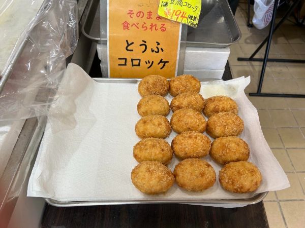 これぞ、お豆腐屋さんのコロッケ!柔らかい口あたりや、大豆の風味は紛れもなく豆腐。そんなたっぷりの魅力に、絶妙な味付けとさっくりとした衣。おやつにも、おかずにも、つまみにも、オールマイティな一品です。ついで買い必須の、商店街の人気者です。