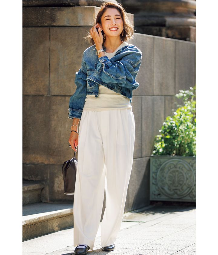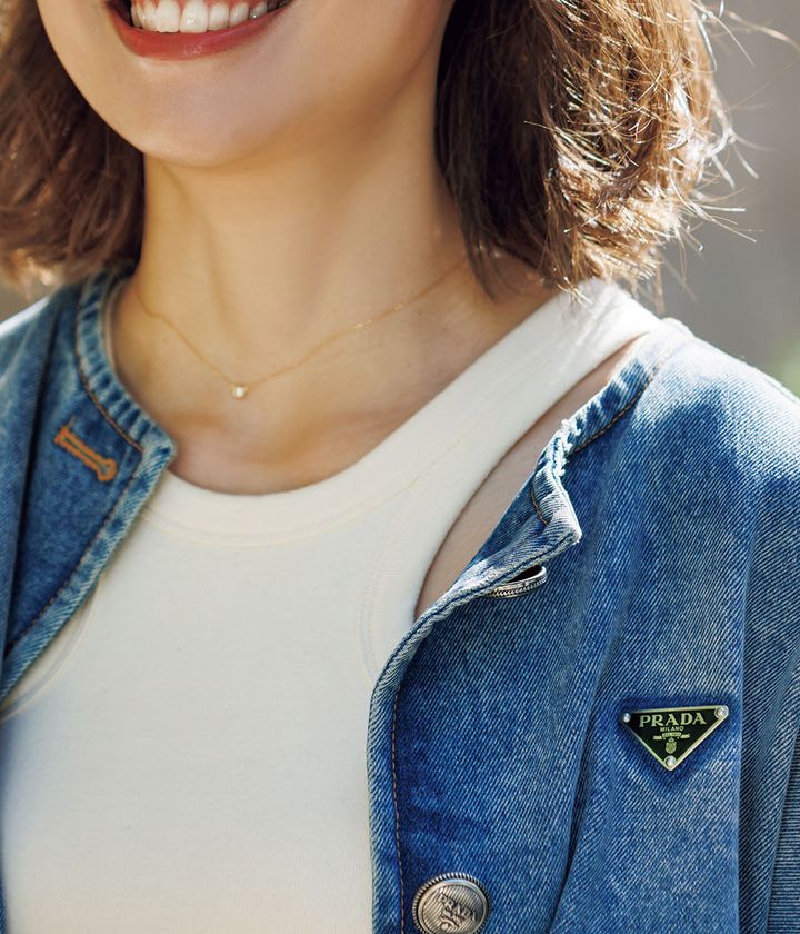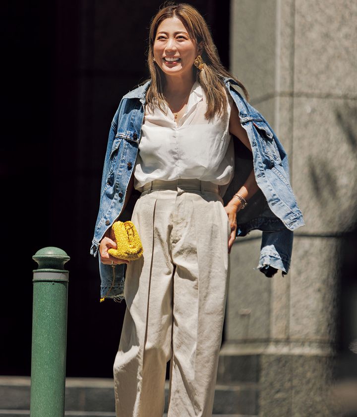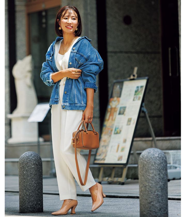 『デニムジャケットが好きで、シーズン毎にチェック。カジュアルなランチなので、少し衿を抜いてゆるっと着ます。バッグと靴のカラーで季節感を出します。』