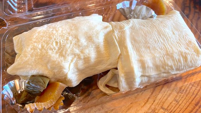 包みを開けると、ふっくらと炊き上げた味つけおこわを、半生のゆばでそっと包んだ「ゆばむすび」が2つ。大きくて四角い形が特徴です。大根・キュウリ・ナスなどのしょうゆ漬けも添えられています。ザ・シンプル! でもこれがいいんです!