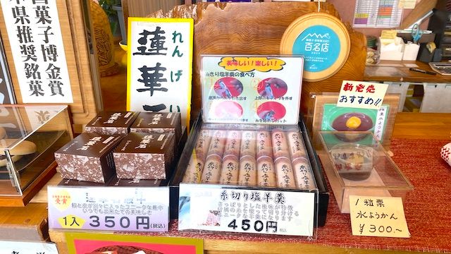 蓮華石(れんげいし)最中 1ヶ350円、3ヶ入1,150円、6ヶ入2,200円/糸切り塩羊羹 450円/1粒栗水ようかん300円〜