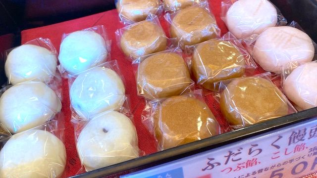 看板商品の補陀洛饅頭もお忘れなく。「補陀洛まんじゅう(小倉つぶ餡)」、「補陀洛の日光温泉まんじゅう(さっぱりこし餡)」、「補陀洛のきんとんまんじゅう(きんとん餡)」とあり、1ヶ150円のバラ売りも、6ヶ1,050円〜の箱入りもあります。箱入りは好きなまんじゅうを選ぶこともできますよ。