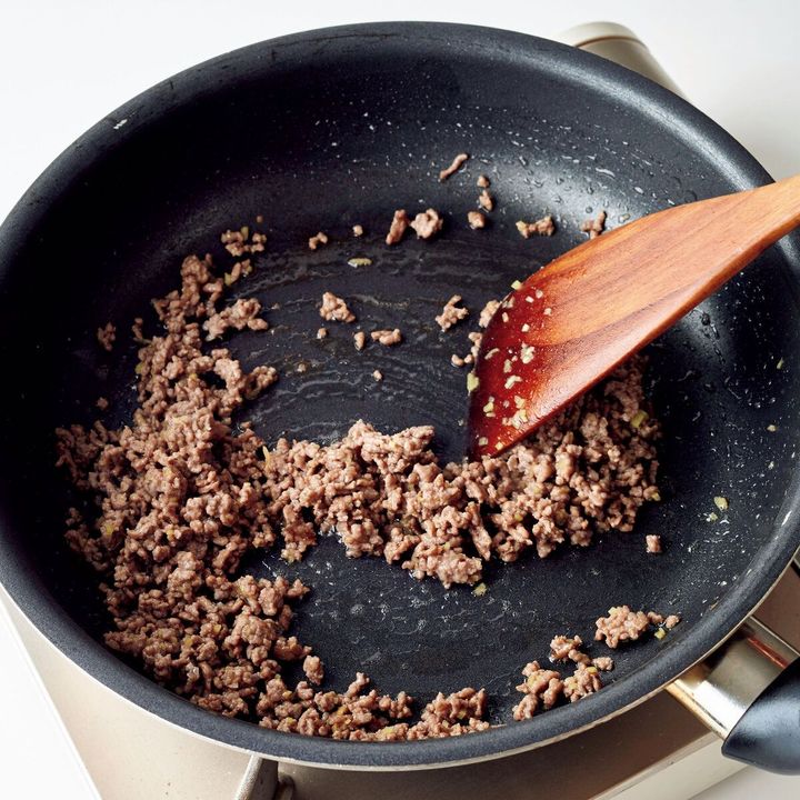 フライパンにごま油小さじ1、しょうがを入れて中火で熱し、香りが立つまで炒める。ひき肉を加えて強めの中火にし、ほぐしながらぽろぽろに炒める。