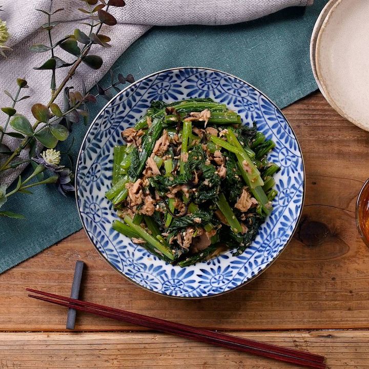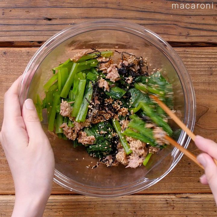 3: 水気をしっかりと拭き取り、ツナ缶、塩こんぶ、にんにく、しょうゆ、ごま油、白いりごまを加えて混ぜ合わせます。