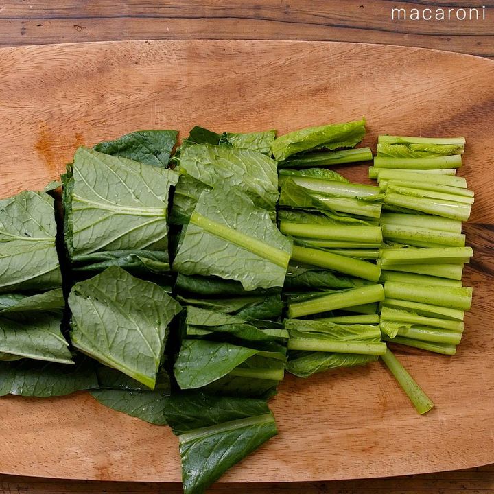1: 小松菜は根元を切り落とし、3cm幅に切ります。