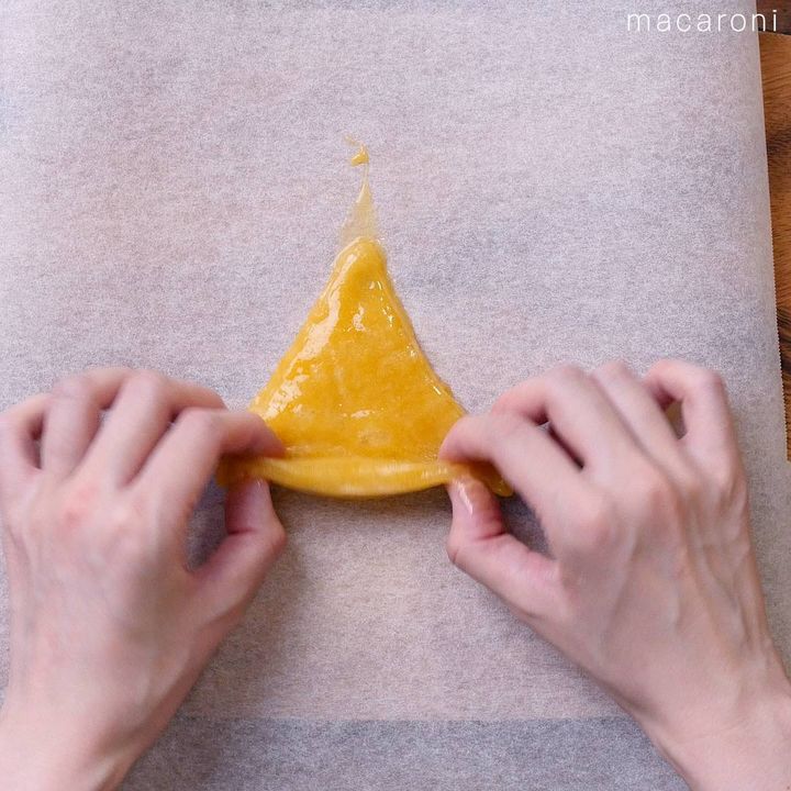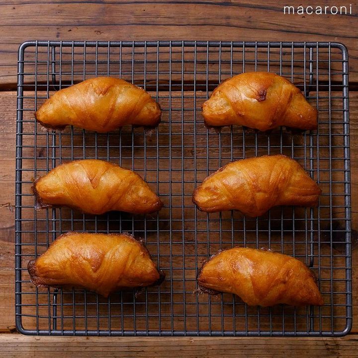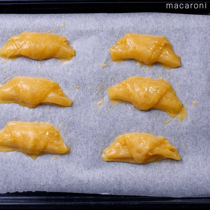 5: 1つ分とり、手前から奥に向かってくるくると巻き上げ、クロワッサン型に整えます。残りの5つも同様にして、計6つ作ります。