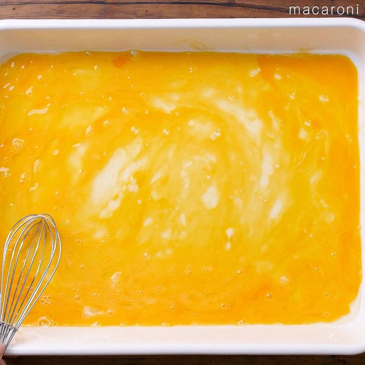 1: 大きめのバットに卵を割り入れて解きほぐします。