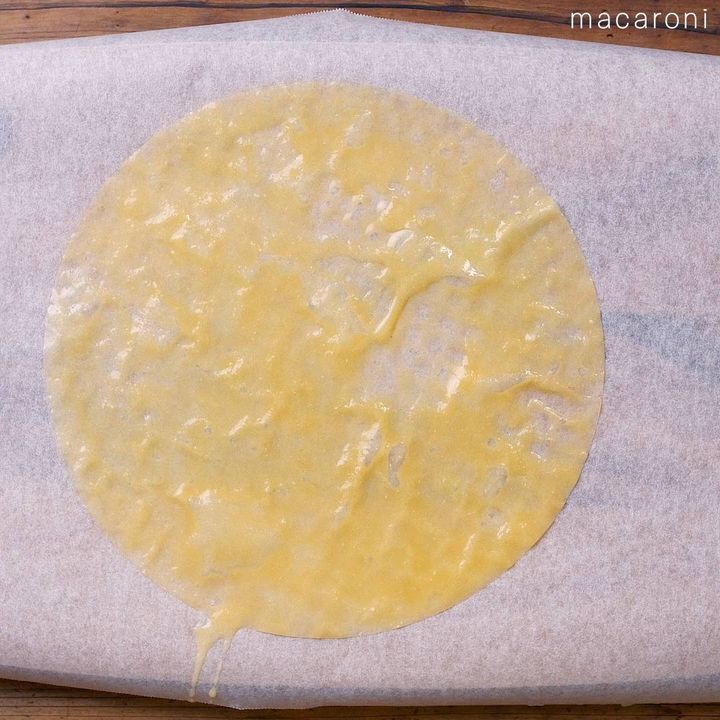 3: ライスペーパーを1枚ずつ卵液に浸し、クッキングシートの上に8枚全て重ねて置きます。