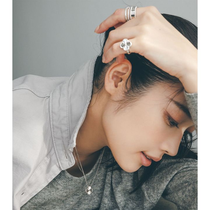 ネックレス「フォルサ チェーン、42㎜」〈WG〉¥105,600ペンダント「ヴィンテージ アルハンブラ」〈WG〉¥583,000リング・人差し指上「エステル」〈Pt〉¥355,300中「フェリシテ、1.25㎜」〈WG×D〉¥517,000下「ペルレ シニアチュール」〈WG〉¥401,500小指「ヴィンテージ アルハンブラ」〈WG〉¥583,000(すべてヴァン クリーフ&アーペル/ヴァン クリーフ&アーペル ル デスク)ニット¥47,300(エイトン/エイトン青山)シャツ¥19,800(ヘルシーデニム/ゲストリスト)