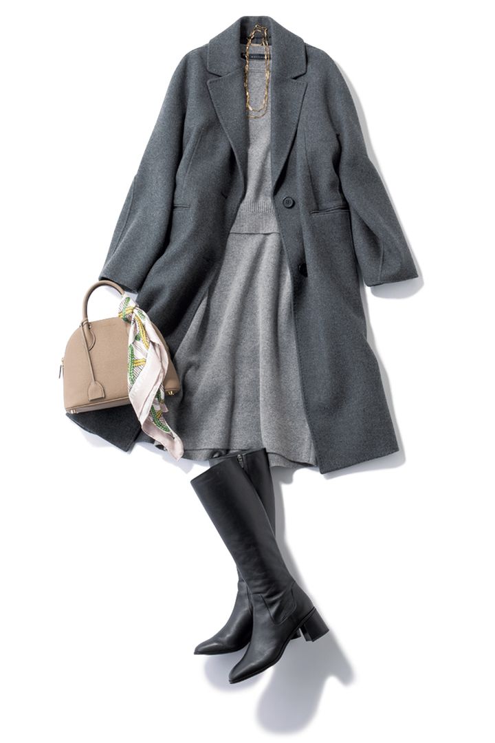 ニットトップス¥29,700ニットスカート¥28,600(ともにマルティニーク/マルティニーク ルミネ横浜)コート¥96,800(カオス/カオス丸の内)バッグ¥165,000(ボナベンチュラ)スカーフ¥39,600(スウォッシュ ロンドン/UTS PR)ブーツ¥44,000(ダイアナ/ダイアナ 銀座本店)ネックレス¥9,900(イン ムード/フォーティーン ショールーム)