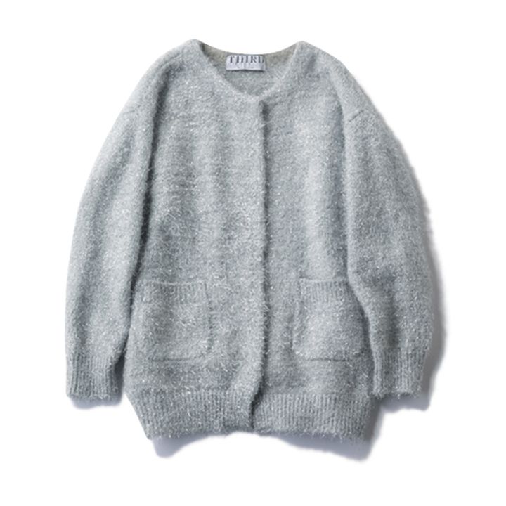 トレンド感のあるラメ素材。アウター級の暖かさが心強い。カーディガン¥39,600(THIRD MAGAZINE)