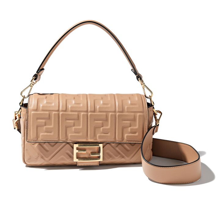 柔らかなナッパレザーに型押しの「FF」ロゴをあしらい、ショルダーストラップを配すなど、時代に合わせてスタイリッシュにアップデートされた名品。バッグ「バゲット」¥489,500(フェンディ/フェンディ ジャパン)