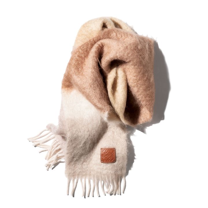 巻き物のラインナップも魅力のロエベ。温もりのあるモヘアマフラーは、同トーンのグラデーションが美しく、レザーパッチがリッチ感を添えています。マフラー¥50,600(ロエベ/ロエベジャパンクライアントサービス)