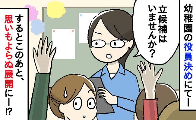 初めての幼稚園役員選出のときの話です。子どもの通う幼稚園ではくじ引きなどは一切おこなわず、すべて立候補で決定するのが慣例ということでした。そのため、1時間以上の沈黙が続くこともあるなど、役員選出はとても大変だと聞いていました。そして当日……、あるママさんの発言により、思いもよらぬ事態が起こったのです――。