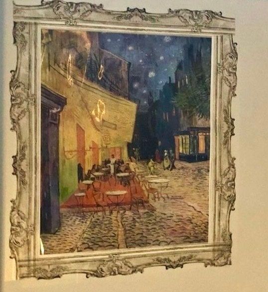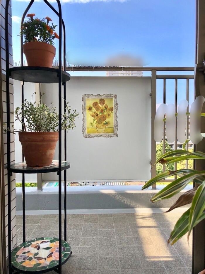 コロナ禍のホームステイ時に「ベランダ美術館」と称して飾ったものです。「ひまわり」と「夜のカフェテラス」のアートポスターをクリアバッグ(100均等でも手に入ります)に入れて額縁柄のマスキングテープで手すり壁に貼り付けました。部屋から屋外に眺められるゴッホ、今も毎日楽しんでいます。