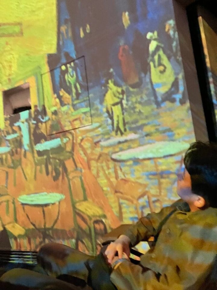 美術館で鑑賞するのとはひと味もふた味も違った体験でした。大写しで次々と動いていく作品から、絵の具の質感たっぷりのゴッホの筆のタッチや美しい色使いをより感じることができます。また、座っていたら向こうから次々と作品たちがやってきてくれる感覚は美術館とは大きく違ってとても新鮮でした。