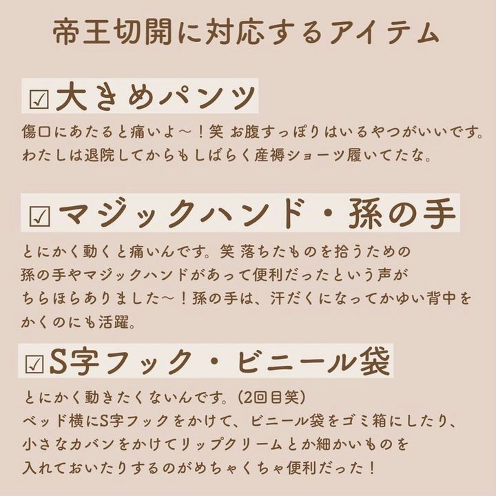 帝王切開で出産した方からは、産後はおなかの傷が痛いことに配慮したグッズのアイデアが寄せられました。私自身も帝王切開を経験しています。