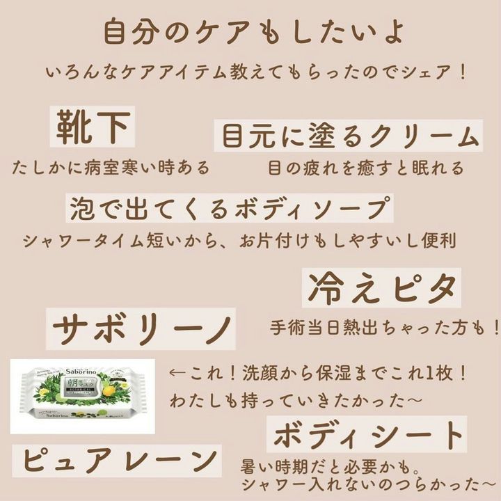 そのほか、入院生活の不便を解消し、少しでも快適に過ごすために使ったグッズがたくさん集まりました。