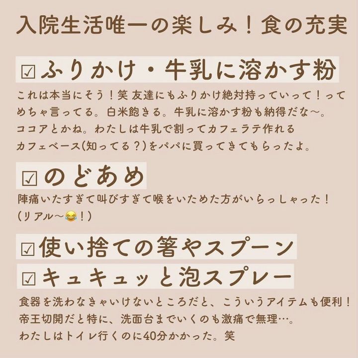 入院先によっては、食事の主食が毎回白米だったり、味が薄かったりすることがあるよう。ふりかけがあると味に変化がつけられて良いですね。カフェラテはカフェインを含むものがあるので、母乳の方は確認を。