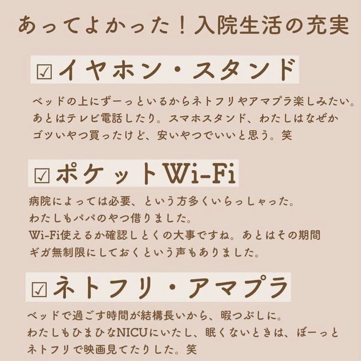 イヤホンは、空いた時間に動画を見たり、テレビ電話をしたりするときにあると便利です。病院によってはWi-Fi設備が無いところもあり、ポケットWi-Fiを持って行った方もいるようです。私もパパのものを持参しました。