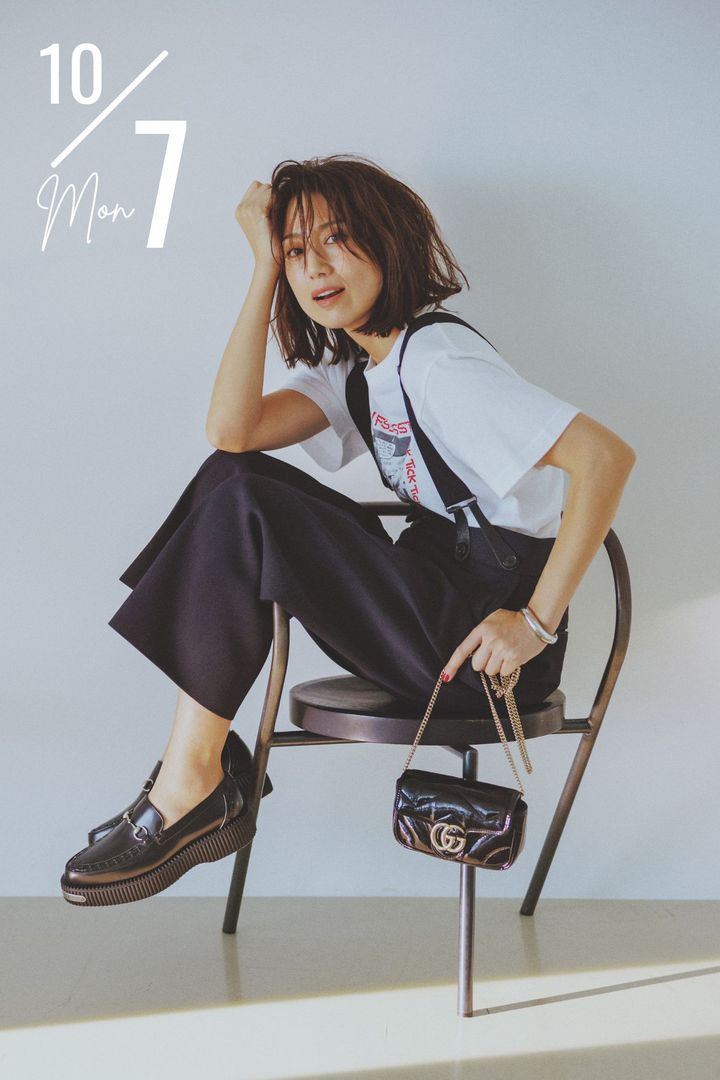 ローファー[H4.5㎝]¥173,800 バッグ¥275,000(ともにグッチ/グッチ クライアントサービス)フォトTシャツ©JohnHolmstrom¥5,720(GOODROCK SPEED/グッドスピード)サスペンダー¥12,100 パンツ¥52,800 ※ともにメンズ(ともにヒューベント/アルファ PR)バングル¥13,750(エイチアッシュ/フォーティーン ショールーム)