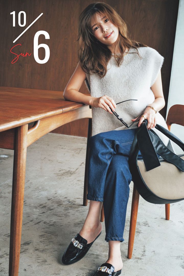 1枚でもレイヤードでも楽しめるベストは、季節またぎの新名品。ふわふわ素材ならデニムコーデも上品に見せてくれます。季節が進んだら、シアーニットやタートルとの重ね着も素敵!