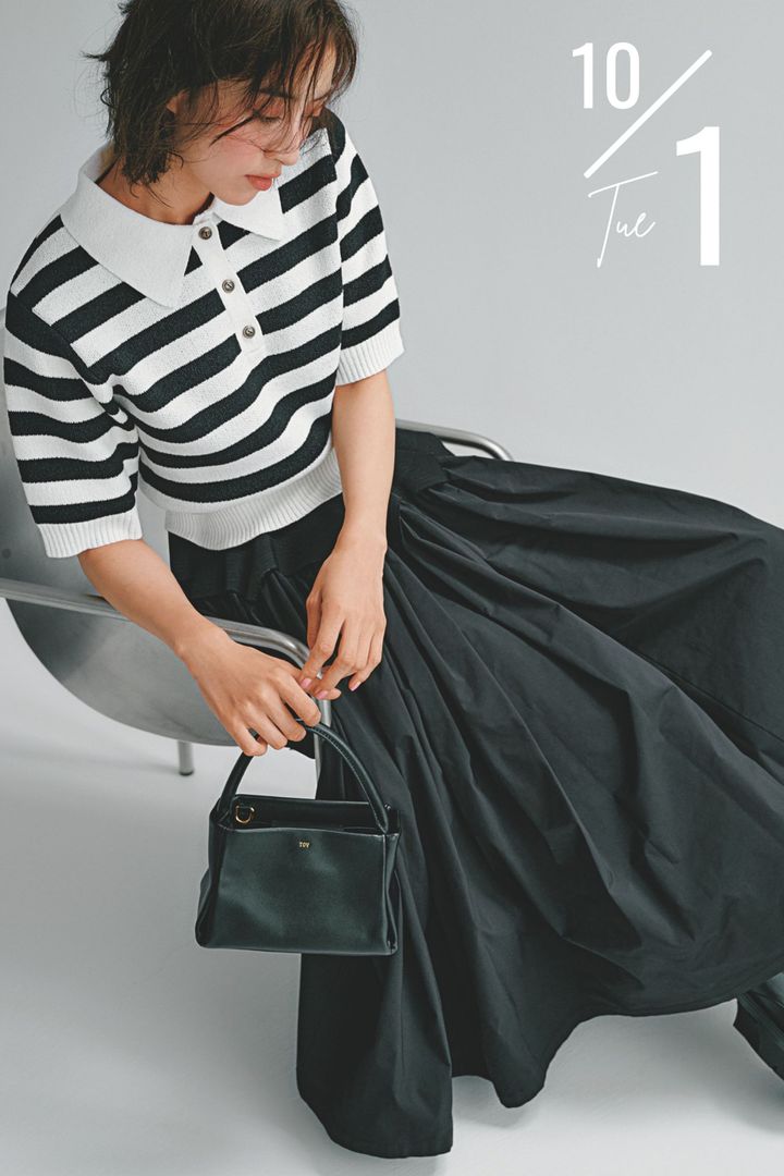 旬なポロニットはスカートとも好相性。全体をモノトーンでまとめれば甘くなりすぎず、きちんとした印象に。足元はローファーやショートブーツを合わせて秋っぽさを楽しんで!
