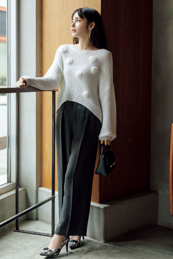 3. 「フラワーモチーフニット」の甘さを引き算!×スラックスで大人の落ち着きを叶えて