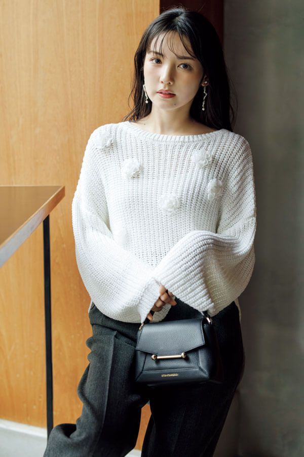ニット¥10,890/リリアン カラット パンツ¥5,980/index イヤリング¥16,500/アンテプリマ(アンテプリマ 新宿髙島屋店) バッグ¥117,900/STRATHBERRY シューズ¥18,150/ダイアナ(ダイアナ 銀座本店)