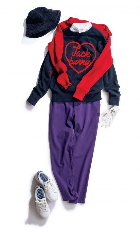 普段、着慣れない色も、顔から離れているパンツ、しかもスリムならボリュームがないので取り入れやすいはず。とくに秋冬はカラフルな色が映えるので、積極的にアクティブカラーにトライを。パープルのストレッチパンツはマットな風合いが上品で、ほどよく個性的。ネイビーのバルキーニットを合わせたプレッピー風コーデで、好感度アップ!パンツ¥14,300、ハット¥6,600(共にロサーセン/グリップインターナショナル) 肩に掛けたパーカ¥15,180(チャンピオン/ヘインズブランズ ジャパン カスタマーセンター) ニット¥17,600、グローブ〈片手〉¥3,080、シューズ¥17,600(以上ジャックバニー!! ) モックネック¥11,000(アディダスゴルフ/アディダス ゴルフお客様窓口)