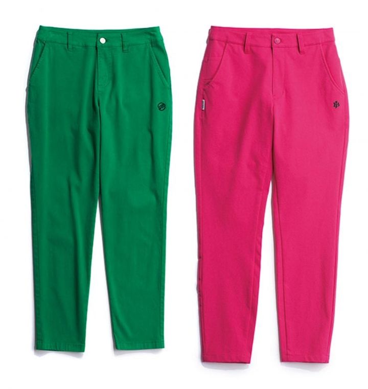 ゴルフシーンでは思い切った色使いがカッコよさに繋がるから、自分に似合うビビッドカラーを見つけたい。右はしっかりとした生地でキレイなライン。左は太腿まわりにゆとりがあり、穿きやすい一本。共にストレッチが利いています。パンツ〈右〉¥10,450(ジャックバニー!!) 〈左〉¥14,300(ロサーセン/グリップインターナショナル)