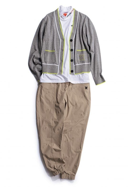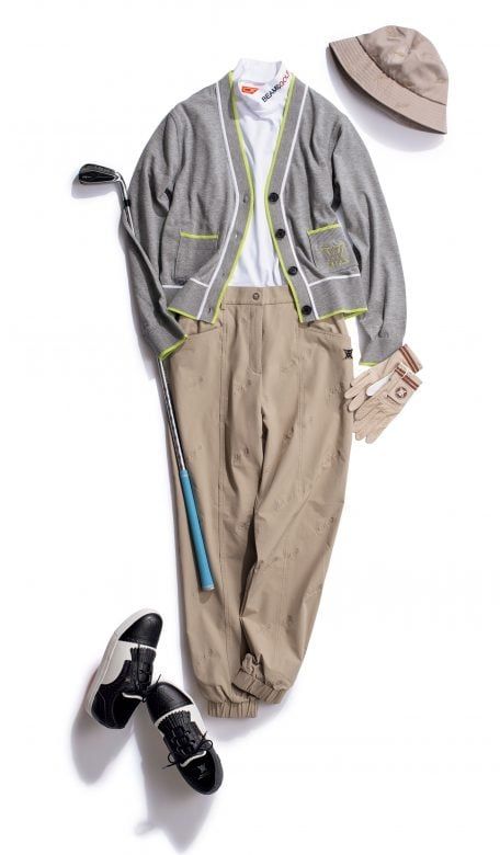 パンツをすっきり軽快に穿きこなしたいなら、インナーはI Nするのが基本です。お腹や腰まわりが気になるからとOUTしていると、もったりとして垢抜けない印象に。とくに全体を柔らかなトーンでまとめた着こなしは、シルエットでメリハリをつけることが大切。案外、体型は気にならないものだから、思い切ってI Nしてみて!パンツ¥48,400、カーディガン¥52,800、ハット¥17,600、グローブ〈両手〉¥9,900、シューズ¥48,400(以上アニューゴルフ) モックネック¥15,400(ビームス ゴルフ/ビームス ゴルフ 有楽町)