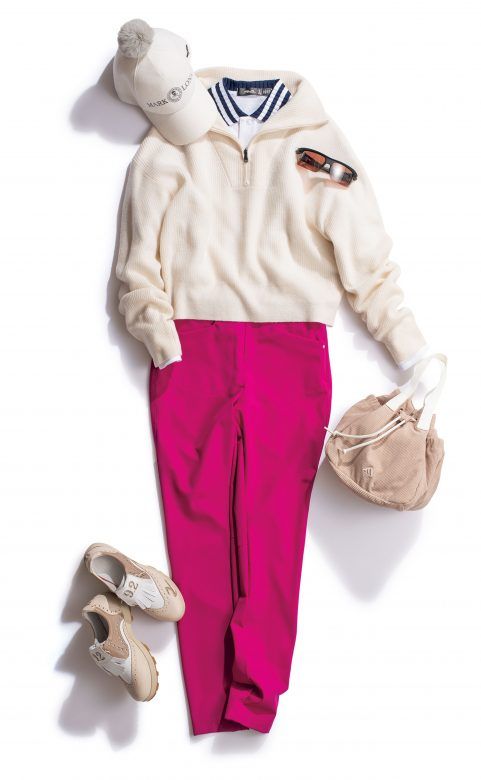 体型が際立つ、上下ともタイトなシルエットでまとめたコーデは難易度高。スリムパンツにはボリュームのあるトップスを合わせ、メリハリをつけるとスタイルアップして見えます。女子力の高いマゼンタピンクのパンツは、美脚効果が期待できる立体的なカッティング。細身ですが、ストレッチが利いていて楽に穿けます。パンツ¥29,700、ニット¥57,200、ポロシャツ¥25,300(以上アールエルエックス ゴルフ/ラルフ ローレン) キャップ¥24,200(マーク & ロナ/マーク & ロナ 青山店) バッグ¥6,930(アディダスゴルフ/アディダス ゴルフお客様窓口) サングラス¥31,240(オークリー/ルックスオティカジャパン カスタマーサービス) シューズ¥74,800(ノーべ・プント・ドゥーエ ゴルフプロ/ノーべ・プント・ドゥーエ ゴルフプロ プレスルーム)