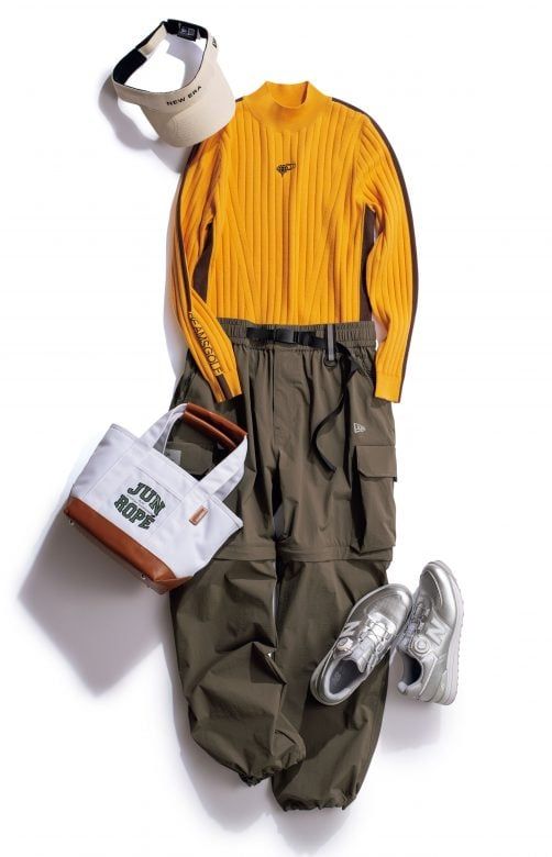 人気継続中のカーゴパンツに、袖や脇のライン使いがスポーティなキレイ色のトップスをオン。マニッシュなカッコよさと華やかさを併せもつ、今どきの洗練スタイルが楽しめます。生地が薄くて軽く、裾がドローストリングなので、軽快に動けるのも嬉しい。膝部分のファスナーで下部が着脱でき、ハーフパンツとしても活躍します。パンツ¥15,400、サンバイザー¥4,400(共にニューエラ) ニット¥22,000(ビームス ゴルフ/ビームス ゴルフ 有楽町) カートバッグ¥14,300(ジュン アンド ロペ) シューズ¥18,700(ニューバランス/ニューバランス ジャパンお客様相談室